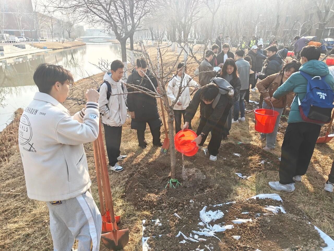 师生们分工明确、默契协作,迅速投入到植树劳动中。在专业园林老师的悉心指导下,大家严格遵循种植规范,从挥锹铲土、扶正树苗,到填土踩实、提水浇灌,每一个环节都一丝不苟、有条不紊全力保障每一棵树苗都能扎根沃土、茁壮成长。